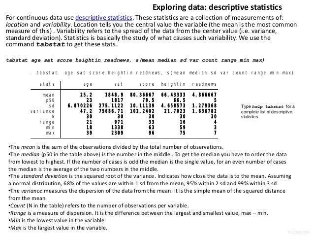It allows you to specify the list of statistics to be displayed. Tabstat fev statmin max range Variance. Tabstat height bysex would present the mean height of males and of females and the overall mean height.